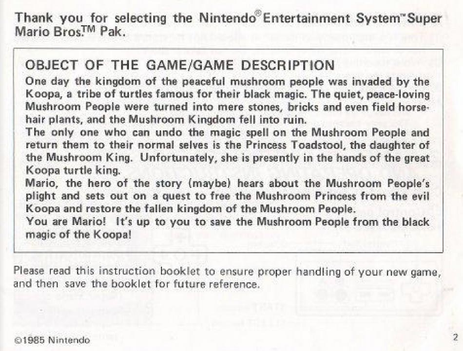 Okay, so there's no narrative and at the time Super Mario Bros. came out, there wasn't much lore or backstory. The most were going to get was printed on page 2 of the instruction booklet: